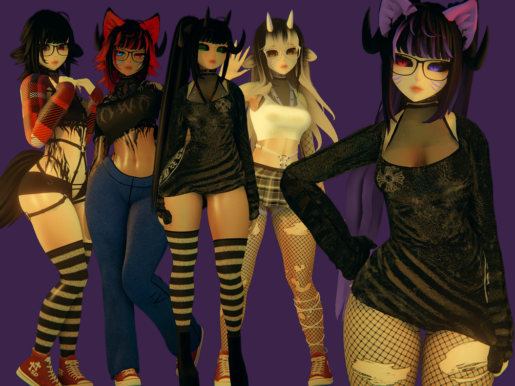 body, head, hair, bangs 1, bangs 2, ears, tail (advent calendar gift), horns, tattoos, underwear, harness, skirt, tank & sleeves, leg fishnets, shorts, shoes, choker, leg ribbon, glasses, arm wrap, icons, jacket,t-shirt, dress, pants, shoes, pigtails, long hair, lamb ears, alternate horns, cat tail